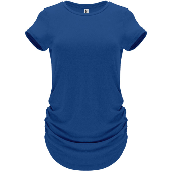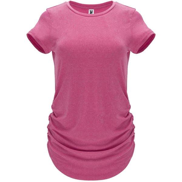 Camiseta técnica multi-deporte de manga corta para mujer. Tejido poliéster tacto algodón. Cuello redondo del mismo tejido. Laterales elásticos fruncidos para mejor adaptación al cuerpo. Corte entallado y largo especial.