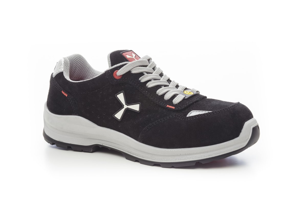 Zapato de seguridad antiestático bajo de mujer, pala de serraje calado repelente al agua y transpirable, forro interior (en toda la superficie interna) transpirable y resistente a la abrasión, 1+1 ojales sin metal y 6+6 agujeros para los cordones reforzados, inserciones reflectantes en el protector de tacón y en el lado exterior de la punta, puntera de aluminio moldeado a presión, plantilla extraíble Ortholite X40 016, plantilla de lámina textil certificada antiperforación, cambrillón antitorsión, base de la puntera con forma de herradura, entresuela de poliuretano ultraligero, amortiguador MASTER BALANCE en PU poliéter de alta tenacidad y densidad equilibrada, suela XTRAIL GRIP en TPU con protector de tacón y de punta.