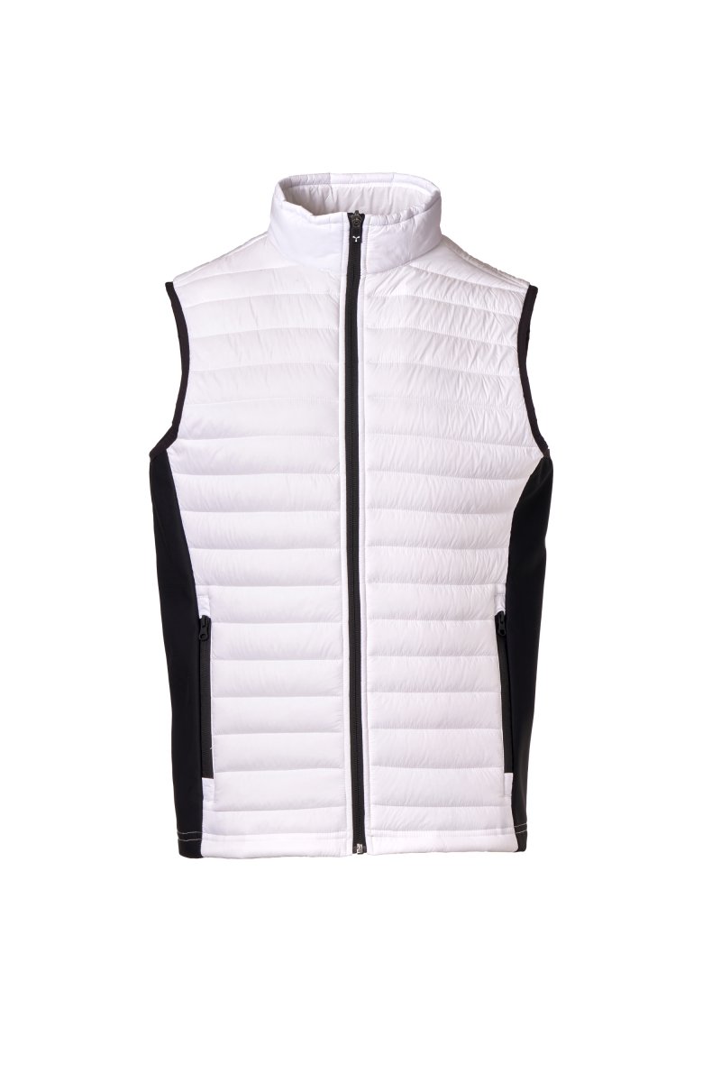 Chaleco acolchado de hombre, costados en soft-shell, cierre con cremallera de plástico con cursor de metal con sistema de bloqueo semiautomático y tirador personalizado, dos bolsillos laterales con cremallera.