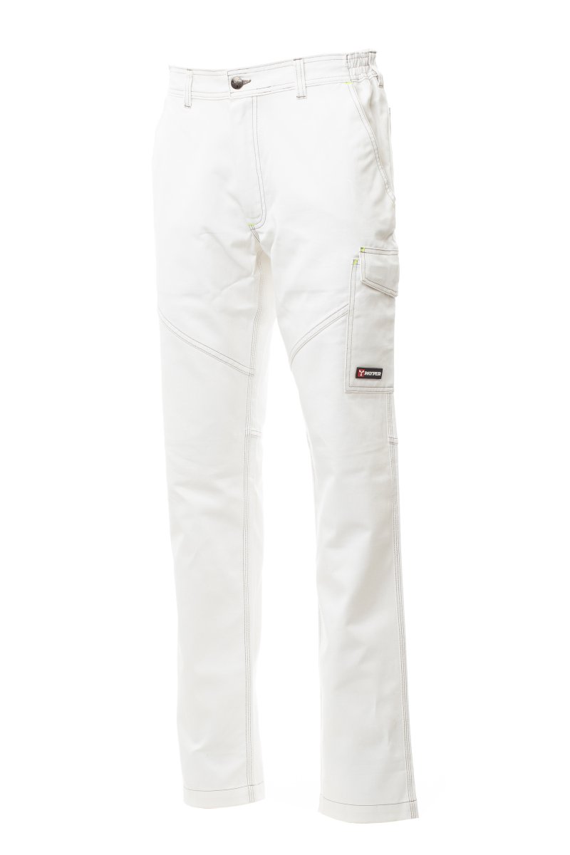 Pantalón unisex, multiestación, con elásticos laterales y trabillas en la cintura, cierre con cremallera y botón de plástico, dos bolsillos delanteros de corte clásico, un bolsillo lateral con LOCK SYSTEM, un soporte para metro; dos bolsillos traseros, uno con tapeta y velcro y otro abierto, aplicaciones y pespuntes en contraste, bandas reflectantes en el bolsillo trasero, costura triple. Botón con remache para el color blanco. Pespuntes y costuras a juego, con presillas en contraste de color amarillo fluorescente para el color Azul marino total.